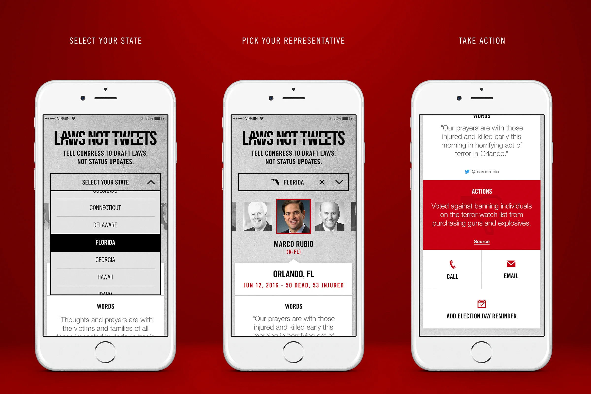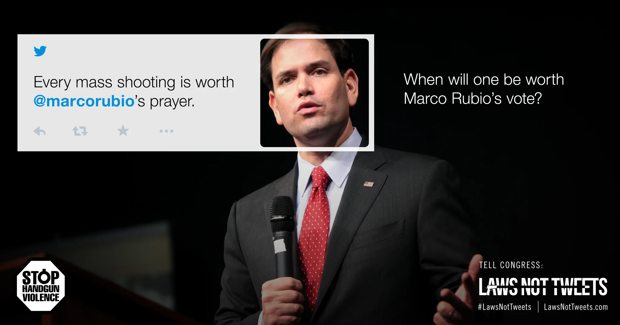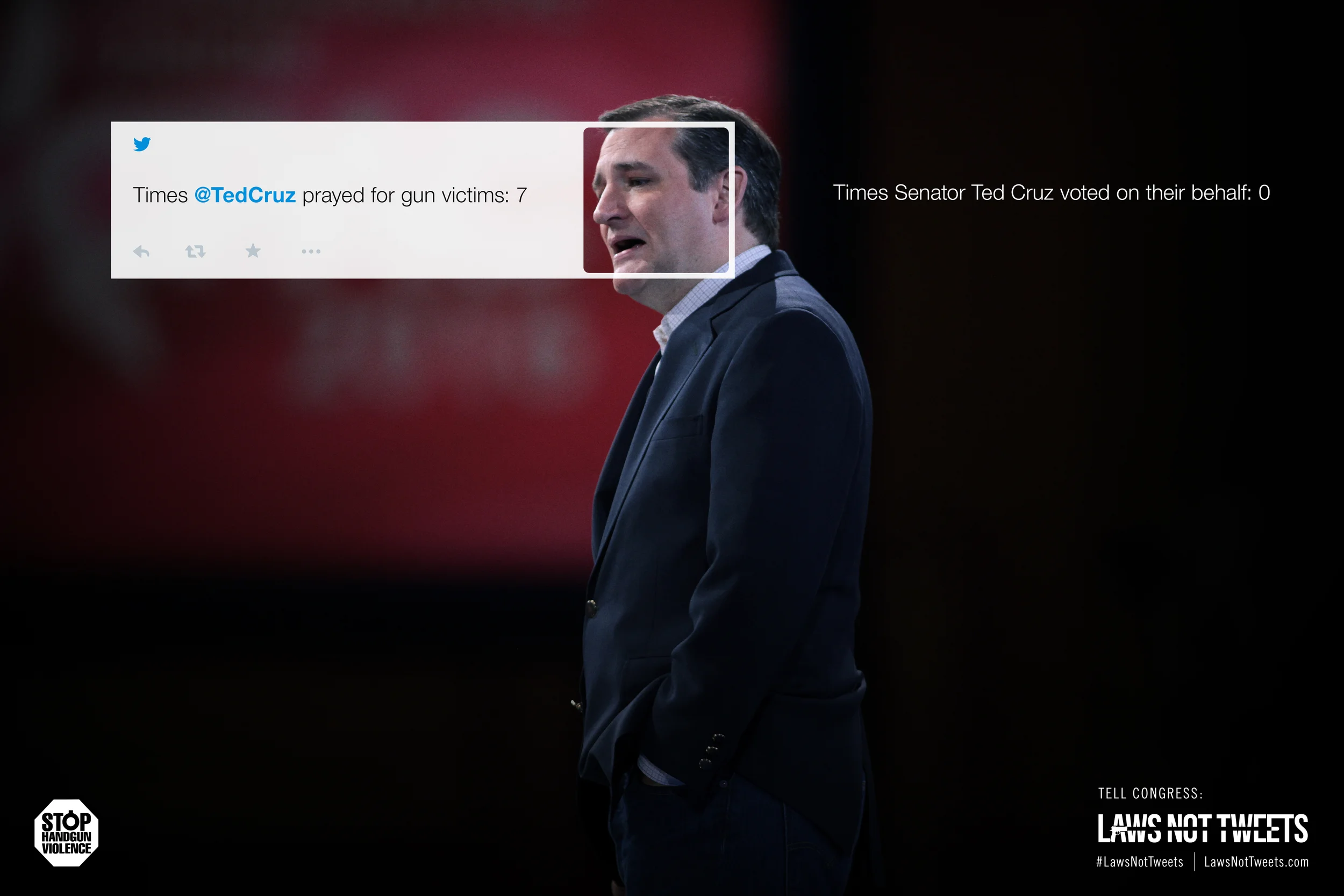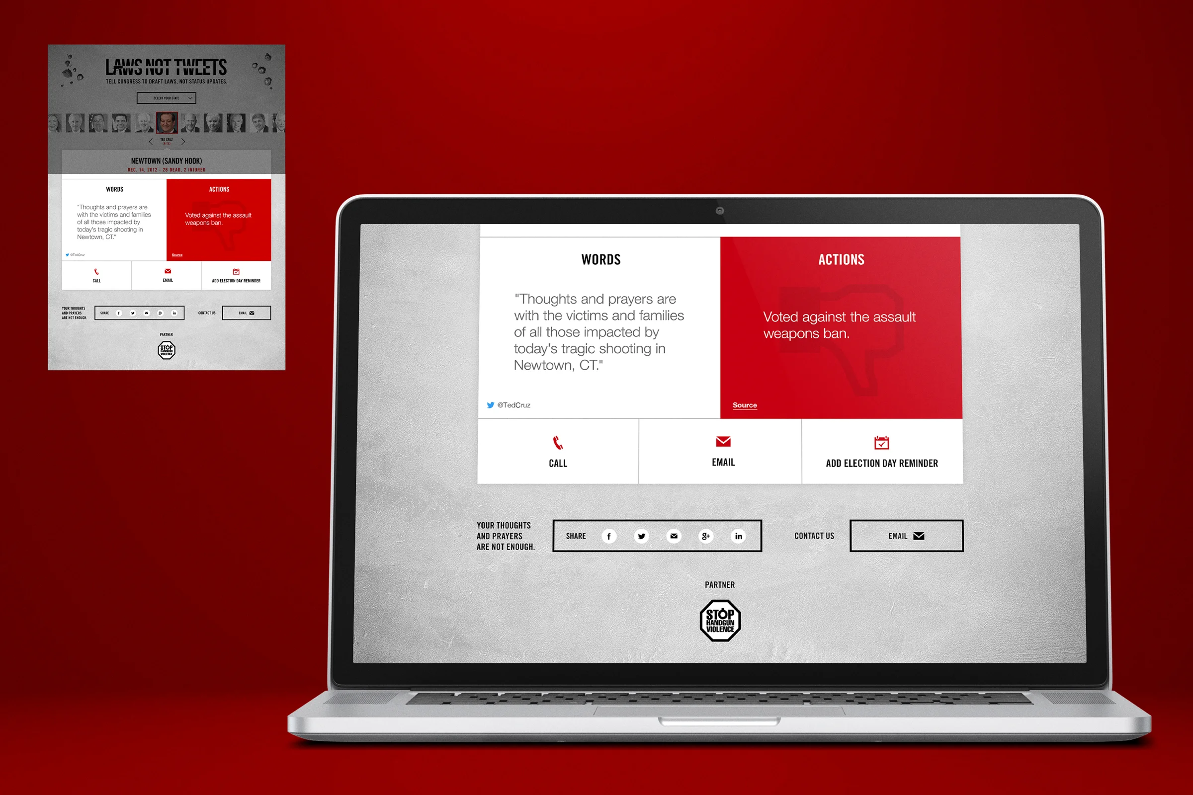 In the wake of every mass shooting, politicians fire out a barrage of tweets and prayers - and nothing else. Enraged at this endless do-nothing cycle, my co-workers and I built Laws Not Tweets, a website that put the ‘thoughts and prayers’ of every NRA-bought politician against their legislative record, and partnered with non-profit Stop Handgun Violence to bring it to life.